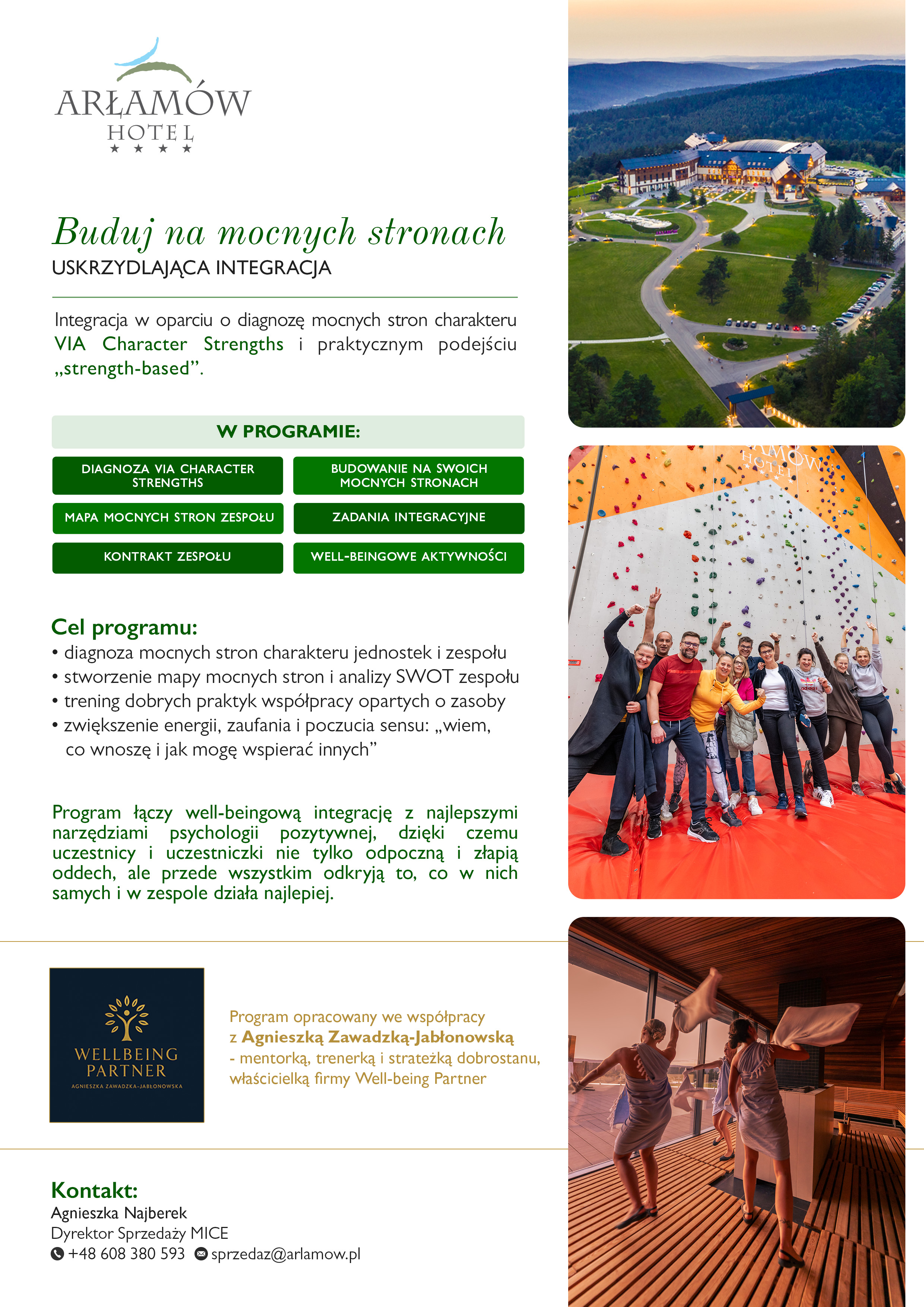 „Buduj na mocnych stronach” to integracja rozwojowa oparta na diagnozie mocnych stron charakteru VIA Character Strengths i praktycznym podejściu „strength-based”. Program łączy well-beingową integrację z najlepszymi narzędziami psychologii pozytywnej, dzięki czemu uczestnicy i uczestniczki nie tylko odpoczną i złapią oddech, ale przede wszystkim odkryją to, co w nich samych i w zespole działa najlepiej – co pozwala doświadczać stanu FLOW oraz motywacji uskrzydlających. Zaplanują też jak świadomie wykorzystywać mocne strony w codziennej współpracy, aby działać skutecznie, odczuwać więcej zaangażowania i budować wysokiej jakości relacje oparte na zaufaniu oraz synergii płynącej z naturalnych predyspozycji.