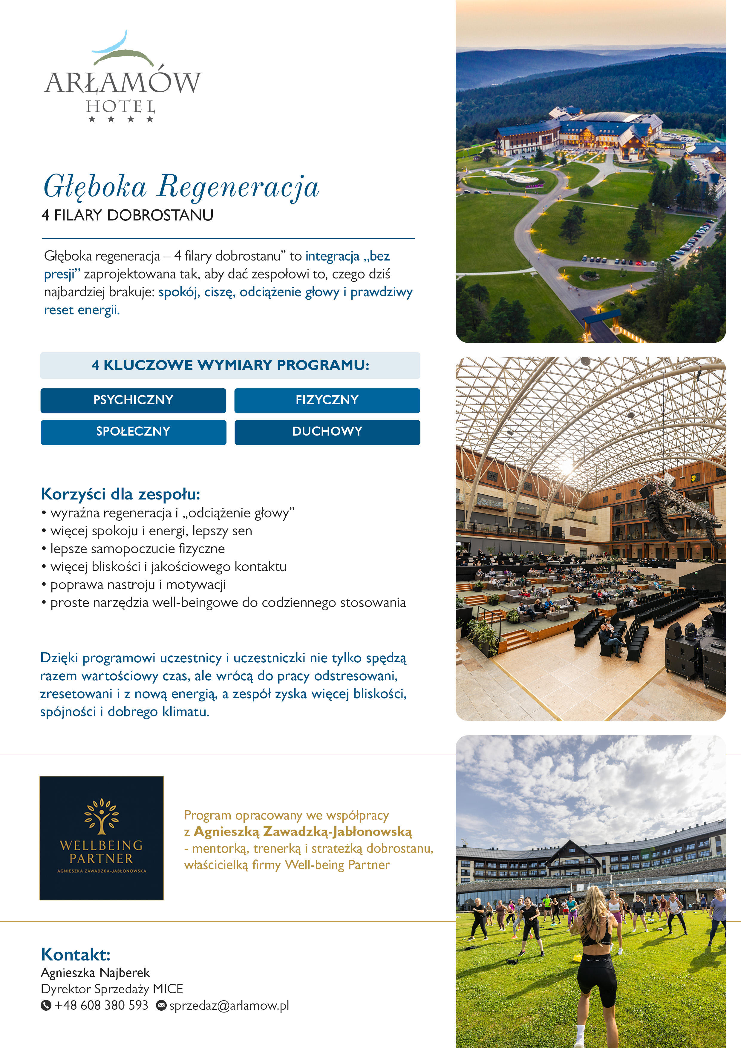 Wierzymy, że dobrostan pracowników to podstawa sukcesu firmy. Hotel Arłamów to nie tylko konferencje – to przestrzeń do odzyskania energii, inspiracji i twórczego myślenia, z dala od zgiełku miasta.