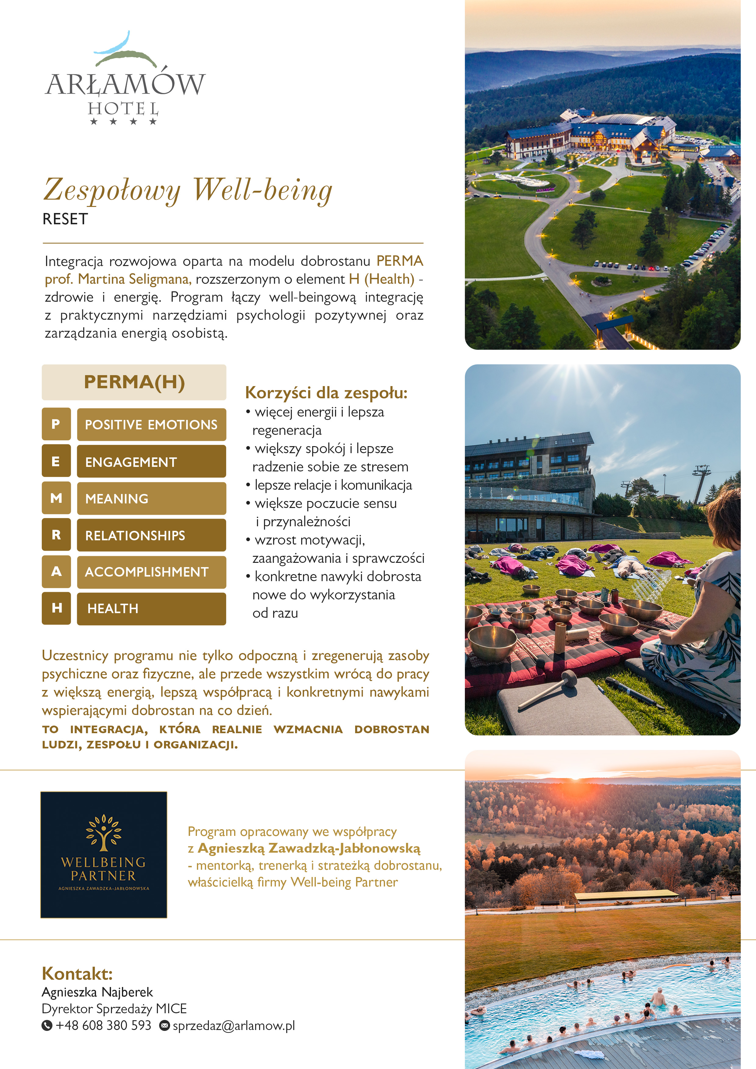 Zespołowy Well-being Reset to integracja rozwojowa oparta na modelu dobrostanu PERMA prof. Martina Seligmana, rozszerzonym o element H (Health) – zdrowie i energię. Program łączy well-beingową integrację z praktycznymi narzędziami psychologii pozytywnej oraz zarządzania energią osobistą. Dzięki temu uczestnicy i uczestniczki nie tylko odpoczną i zregenerują zasoby psychiczne oraz fizyczne, ale przede wszystkim wrócą do pracy z większą energią, lepszą współpracą i konkretnymi nawykami wspierającymi dobrostan na co dzień.
