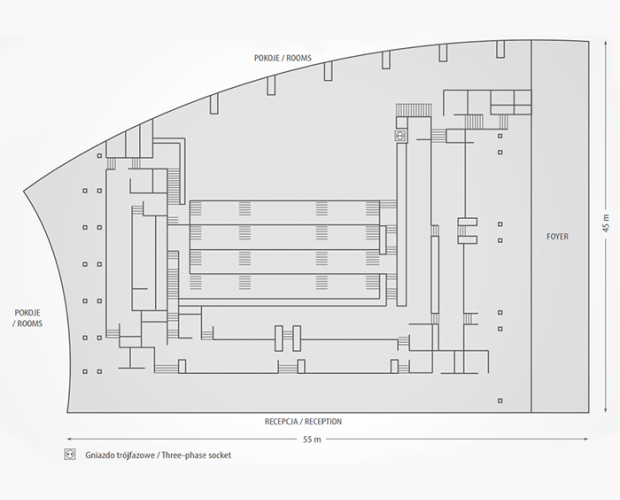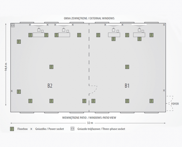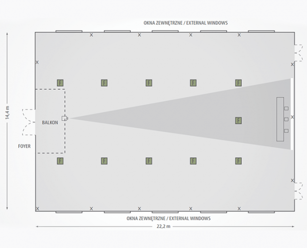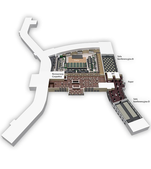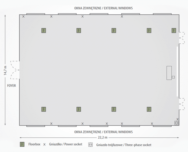 Sala wielofunkcyjna o powierzchni 320 m2. Ze względu na bardzo elegancki wystrój oraz wysokość, doskonale nadaje się na organizację bankietów, wesel lub pokazów. Dodatkowo, tuż przed salą znajduje się przestronne foyer o powierzchni 420 m2, które może być wykorzystywanie jako przestrzeń wystawiennicza.